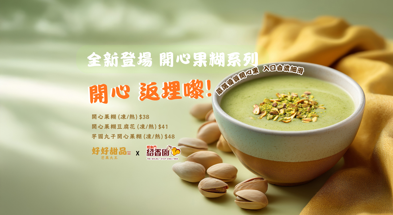 好好甜品與57年歷史的香港果仁老字號「鯉魚門紹香園」攜手推出全新「開心果糊系列」糖水,以系列口號「開心 返埋嚟!」帶出把歡笑與團聚味道帶回日常的初心。